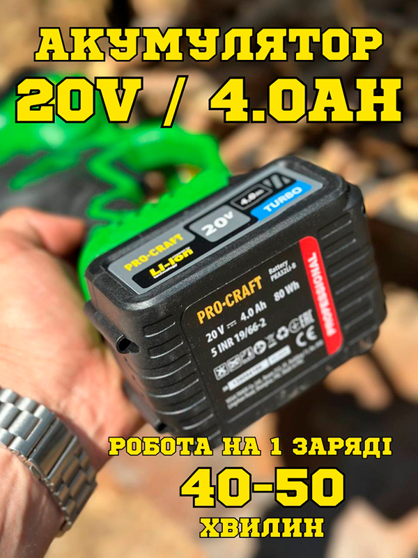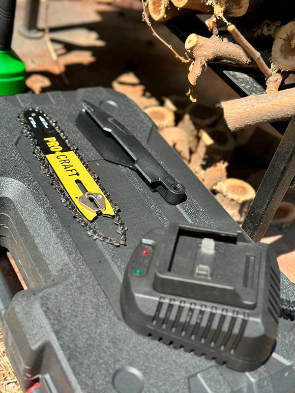 Потужна акумуляторна цепна пила PROCRAFT - Найкраща та потужна портативна пилка у своєму роді, яка за рахунок потужного двигуна здатна спилювати не тільки гілки дерев у садівництві, а й поступово розпиляти досить великі колоди для деревозаготівлі!