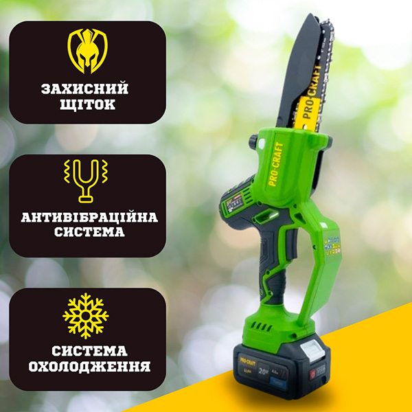 Потужна акумуляторна цепна пила PROCRAFT - Найкраща та потужна портативна пилка у своєму роді, яка за рахунок потужного двигуна здатна спилювати не тільки гілки дерев у садівництві, а й поступово розпиляти досить великі колоди для деревозаготівлі!
