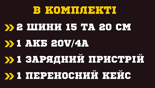 Тип двигуна: безщітковий – висока ефективність та довговічність. Напруга двигуна: 20 В – забезпечує стабільну роботу.